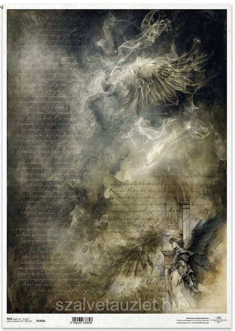 angyal, éteri szárnyak, füst, gótikus boltív, melankólia, vintage, öregített szöveg, sötét fantázia